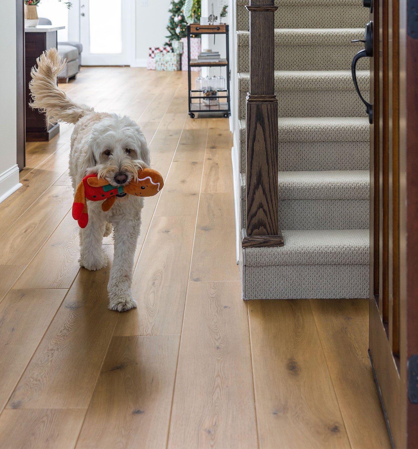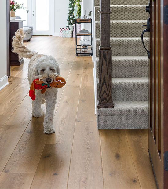 Pet friendly flooring comes in a variety of widths, lengths and styles. They are all durable and can stand up to paws, drool any other things that may come your way. The different collections of COREtec flooring are created with specific advantages and features to meet your specific needs. We have curated different styles that can stand up to the needs of active homes with kids, dogs or any other lifestyle that needs to stand up to the wear and tear of active homes. To compare the different flooring, visit our Compare Flooring page to see determine the features that are most important to you.
